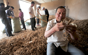 |   甘肅省定西市臨洮縣洮陽鎮(zhèn)陽屲村黨支部書記瓦廣吉(右一)在村里的中藥材庫房內(nèi)查看藥材品質(zhì)。新華社記者 張錳