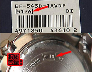 李先生再次仔細(xì)檢查了自己購買的這塊手表之后,又發(fā)現(xiàn)了一個(gè)奇怪的問題,這塊表外包裝盒上標(biāo)注的機(jī)芯編號(hào)是5126,而手表背面標(biāo)注的機(jī)芯編號(hào)卻是5118。這樣的情況再次加深了李先生對(duì)于從當(dāng)當(dāng)網(wǎng)購買的這塊卡西歐手表真?zhèn)蔚膽岩伞?BR> 就在這時(shí),李先生想起了在當(dāng)當(dāng)網(wǎng)卡西歐手表的宣傳頁上,大多有“原裝正品,專柜驗(yàn)貨”的宣傳語,于是李先生拿著自己從當(dāng)當(dāng)網(wǎng)上購買的這塊卡西歐手表,前往北京的卡西歐手表銷售專柜,尋求幫助。