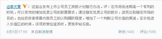 李大霄稱:“證監(jiān)會(huì)發(fā)布上市公司員工持股計(jì)劃暫行辦法,在市場低迷期是一個(gè)有利的時(shí)機(jī),可以有效的增加優(yōu)質(zhì)公司的股票需求,通過穩(wěn)定優(yōu)質(zhì)公司的股價(jià),進(jìn)而達(dá)到穩(wěn)定市場的目的,也給投資者根據(jù)內(nèi)部員工的認(rèn)購踴躍程度,增加了一個(gè)判斷公司價(jià)值的渠道,在價(jià)格進(jìn)入價(jià)值區(qū)的時(shí)候,該項(xiàng)政策恰逢其時(shí),更筑牢鉆石底!本W(wǎng)友“楊大牛的爸爸”對于李大霄這一觀點(diǎn),顯然有著完全不同的看法,他認(rèn)為,這些雕蟲小技不會(huì)使經(jīng)濟(jì)面發(fā)生任何變化,所以股市中長期仍將處于下行通道中。周一肯定會(huì)漲,但不會(huì)改變總體下行的趨勢,鉆石底早破了,真正的底在1800點(diǎn)以下某個(gè)點(diǎn)位。著名財(cái)經(jīng)評論人余豐慧也風(fēng)趣的評論說,小李心態(tài)好,什么都是利好。