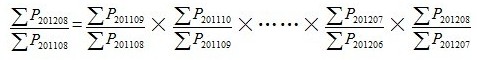 3、同比價(jià)格指數(shù)的計(jì)算方法。由于部分城市用以計(jì)算同比價(jià)格指數(shù)的基期網(wǎng)簽數(shù)據(jù)缺失,故不能計(jì)算2012年10月前各月與網(wǎng)簽數(shù)據(jù)同一口徑的同比價(jià)格指數(shù)。為保持同比價(jià)格指數(shù)計(jì)算和發(fā)布的連續(xù)性和穩(wěn)定性,滿足有關(guān)方面的需要,國(guó)家統(tǒng)計(jì)局采用有關(guān)房?jī)r(jià)統(tǒng)計(jì)數(shù)據(jù)和按網(wǎng)簽數(shù)據(jù)計(jì)算的房?jī)r(jià)數(shù)據(jù),根據(jù)同比指數(shù)和環(huán)比指數(shù)之間的數(shù)學(xué)關(guān)系,對(duì)8月份同比價(jià)格指數(shù)的計(jì)算進(jìn)行了技術(shù)處理:將2011年9—12月的環(huán)比數(shù)據(jù)連乘再乘以今年1—8月的環(huán)比數(shù)據(jù)生成本月同比價(jià)格指數(shù)。以此類推可計(jì)算其他月份的同比價(jià)格指數(shù)。計(jì)算公式表示為: