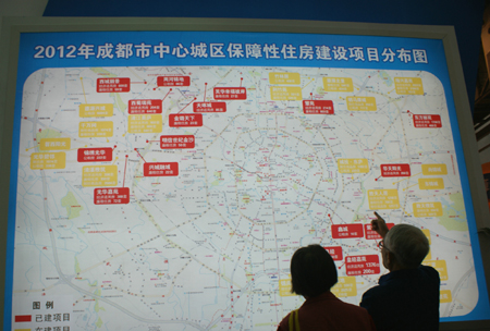 10月6日,在2012年成都市秋季房地產(chǎn)交易會上展出的公租房、廉租房、經(jīng)濟適用房、限價商品房等成都市保障房項目受到眾多市民的關(guān)注。 圖為兩位老人在2012年成都秋季房交會上觀看保障房建設(shè)項目分布表。