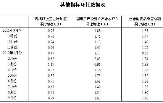 2011年各季度及2012年一、二、三季度GDP環(huán)比增速分別為2.2%、2.5%、2.4%、1.7%、1.5%、2.0%和2.2%。
