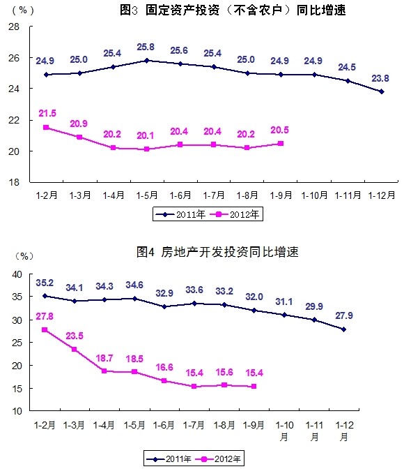 前三季度,固定資產(chǎn)投資(不含農(nóng)戶)256933億元,同比名義增長20.5%(扣除價格因素實際增長18.8%),增速比上半年加快0.1個百分點。其中,國有及國有控股投資84444億元,增長13.6%。分地區(qū)看,東部地區(qū)投資同比增長18.4%,中部地區(qū)增長25.8%,西部地區(qū)增長24.1%。分產(chǎn)業(yè)看,第一產(chǎn)業(yè)投資6545億元,同比增長32.2%;第二產(chǎn)業(yè)投資113662億元,增長22.4%;第三產(chǎn)業(yè)投資136725億元,增長19.4%。在第二產(chǎn)業(yè)投資中,工業(yè)投資110745億元,同比增長22.5%。其中,采礦業(yè)投資8855億元,增長17.4%;制造業(yè)投資90116億元,增長23.5%;電力、熱力、燃氣及水的生產(chǎn)和供應業(yè)投資11774億元,增長19.1%。前三季度基礎設施(不包括電力、熱力、燃氣及水的生產(chǎn)與供應)投資38677億元,同比增長10.2%,增速比上半年加快5.8個百分點。從到位資金情況看,前三季度到位資金289408億元,同比增長18.2%。其中,國家預算資金增長27.4%,國內(nèi)貸款增長8.8%,自籌資金增長21.9%,利用外資下降6.3%,其他資金增長10.3%。前三季度,新開工項目計劃總投資226866億元,同比增長25.7%,比上半年加快2.5個百分點;新開工項目276276個,同比增加19327個。從環(huán)比看,9月份固定資產(chǎn)投資(不含農(nóng)戶)增長1.63%。