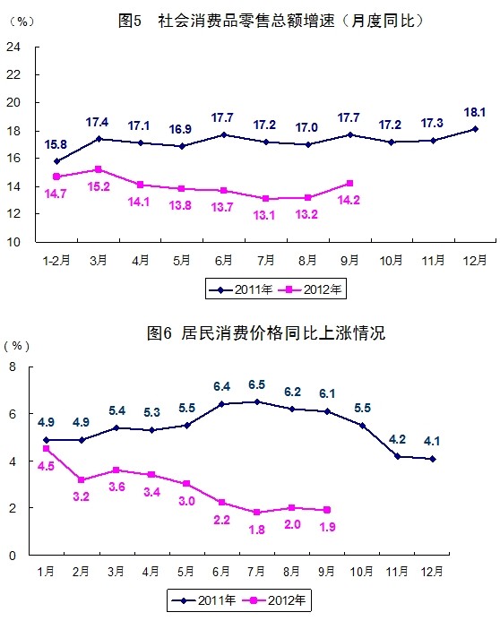 前三季度,社會消費品零售總額149422億元,同比名義增長14.1%(扣除價格因素實際增長11.6%),增速比上半年回落0.3個百分點。其中,限額以上企業(yè)(單位)消費品零售額71580億元,同比增長14.4%。按經(jīng)營單位所在地分,城鎮(zhèn)消費品零售額129332億元,同比增長14.0%;鄉(xiāng)村消費品零售額20090億元,增長14.4%。按消費形態(tài)分,餐飲收入16673億元,同比增長13.2%;商品零售132749億元,增長14.2%。在商品零售中,限額以上企業(yè)(單位)商品零售額66066億元,同比增長14.6%。其中,汽車類增長6.9%,家具類增長26.2%,家用電器和音像器材類增長6.1%。9月份,社會消費品零售總額同比名義增長14.2%(扣除價格因素實際增長13.2%),環(huán)比增長1.46%。