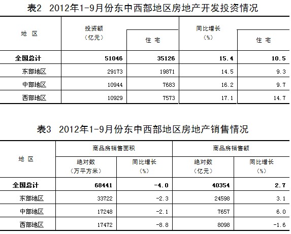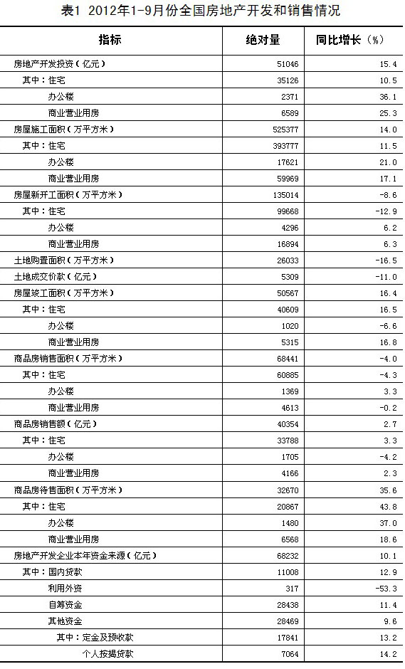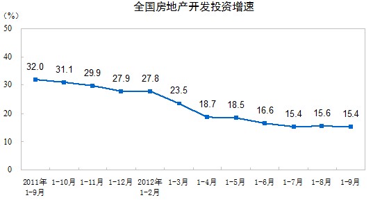 2012年1-9月份,全國房地產(chǎn)開發(fā)投資51046億元,同比名義增長15.4%(扣除價格因素實際增長13.8%),增速比1-8月份回落0.2個百分點。其中,住宅投資35126億元,增長10.5%,增速回落0.1個百分點,占房地產(chǎn)開發(fā)投資的比重為68.8%。