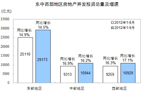 1-9月份,東部地區(qū)房地產(chǎn)開發(fā)投資29173億元,同比增長14.5%,增速比1-8月份回落0.4個百分點;中部地區(qū)房地產(chǎn)開發(fā)投資10944億元,增長16.2%,增速回落0.7個百分點;西部地區(qū)房地產(chǎn)開發(fā)投資10929億元,增長17.1%,增速提高0.8個百分點。