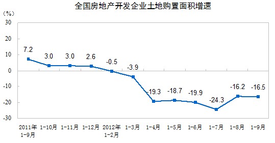 1-9月份,房地產(chǎn)開發(fā)企業(yè)土地購置面積26033萬平方米,同比下降16.5%,降幅比1-8月份擴大0.3個百分點;土地成交價款5309億元,下降11.0%,降幅擴大3.4個百分點。