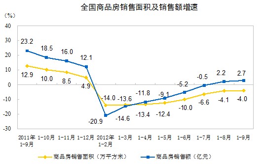 1-9月份,商品房銷售面積68441萬平方米,同比下降4.0%,降幅比1-8月份縮小0.1個百分點;其中,住宅銷售面積下降4.3%,辦公樓銷售面積增長3.3%,商業(yè)營業(yè)用房銷售面積下降0.2%。商品房銷售額40354億元,增長2.7%,增速比1-8月份提高0.5個百分點;其中,住宅銷售額增長3.3%,辦公樓銷售額下降4.2%,商業(yè)營業(yè)用房銷售額增長2.3%。