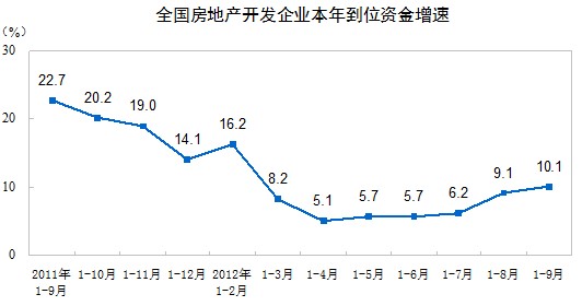 1-9月份,房地產(chǎn)開發(fā)企業(yè)本年到位資金68232億元,同比增長10.1%,增速比1-8月份提高1個百分點。其中,國內(nèi)貸款11008億元,增長12.9%;利用外資317億元,下降53.3%;自籌資金28438億元,增長11.4%;其他資金28469億元,增長9.6%。在其他資金中,定金及預(yù)收款17841億元,增長13.2%;個人按揭貸款7064億元,增長14.2%。