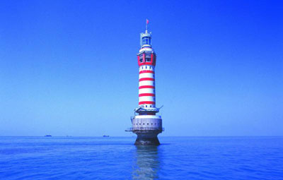 大沽燈塔矗立在大沽口外的海面上,建于1978年,高達(dá)56.45米,是我國目前自行設(shè)計(jì)、自行建造的第一座海上最高燈塔。2006年5月22日,國家郵政局發(fā)行了一套特種郵票《現(xiàn)代燈塔》,共四枚,第一枚便是大沽燈塔。燈塔呈圓型,外部飾以白瓷磚和紅白玻璃,紅白相間,具有一種和諧美。塔頂裝有巨型燈具,無論陰、晴、雨、霧,都能發(fā)光導(dǎo)航。尤其是夜間,可以發(fā)出旋轉(zhuǎn)著的強(qiáng)烈興束,射程達(dá)70海里。這座宏偉的12層燈塔,成為塘沽新港的象征。