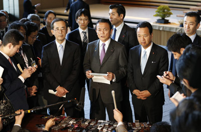 日本副首相兼財(cái)相麻生太郎(中)、日本央行行長(zhǎng)白川方明(左)與經(jīng)濟(jì)財(cái)政政策擔(dān)當(dāng)大臣甘利明22日出席新聞發(fā)布會(huì),共同發(fā)表聯(lián)合聲明。麻生太郎表示,日本政府高度認(rèn)同日本央行推行新的貨幣寬松政策。當(dāng)日,日本央行在結(jié)束為期兩天的金融政策會(huì)議后宣布,引入2%的通脹目標(biāo),并決定自2014年起實(shí)施每月定期購(gòu)入資產(chǎn)的“無限期”貨幣寬松措施。有媒體指出,日本央行的這一手法實(shí)際上與美聯(lián)儲(chǔ)的“無上限貨幣寬松”如出一轍。濫發(fā)貨幣可能導(dǎo)致日元長(zhǎng)期國(guó)債信用度下降,利率攀升,給金融市場(chǎng)埋下隱患。