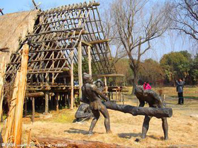 河姆渡遺址位于余姚市河姆渡鎮(zhèn)金吾廟村。它是1973年夏天當(dāng)?shù)剞r(nóng)民建造排澇站時發(fā)現(xiàn)的,總面積約4萬平方米,自下而上疊壓著4個文化層,根據(jù)北京大學(xué)碳14實驗室測定,第四文化層距今約7000-6500年,第三文化層距今約6500-6000年,第二文化層距今約6000-5500年,第一文化層距今約5500-5000年。該遺址于1973年和1977年冬進行過兩次考古發(fā)掘,合計面積2630平方米,出土生產(chǎn)工具、生活器具、原始藝術(shù)品等文物6700余件,還發(fā)現(xiàn)豐富的栽培稻谷和大面積的木建筑遺跡、捕獵的野生動物和家養(yǎng)動物的骨骸、采集的植物果實及少量的墓葬等遺存。所有這些,為研究中國遠古時代的農(nóng)業(yè)、建筑、制陶、紡織、藝術(shù)和東方文明的起源以及古地理、古氣候、古水文的演變提供了極其珍貴的實物資料。河姆渡遺址第一、第二文化層的出土文物與浙江省內(nèi)湖州邱城遺址下層及嘉興市郊馬家濱遺址的器物相似,第三、第四文化層的出土文物,在浙江則是新發(fā)現(xiàn),而且它已擁有較為發(fā)達的耜耕農(nóng)業(yè)、采用榫卯技術(shù)的干欄式建筑,在國內(nèi)同時代的遺址中,它的生產(chǎn)、生活水平處于領(lǐng)先地位,因此是一支全新的考古學(xué)文化,故命名為河姆渡文化!