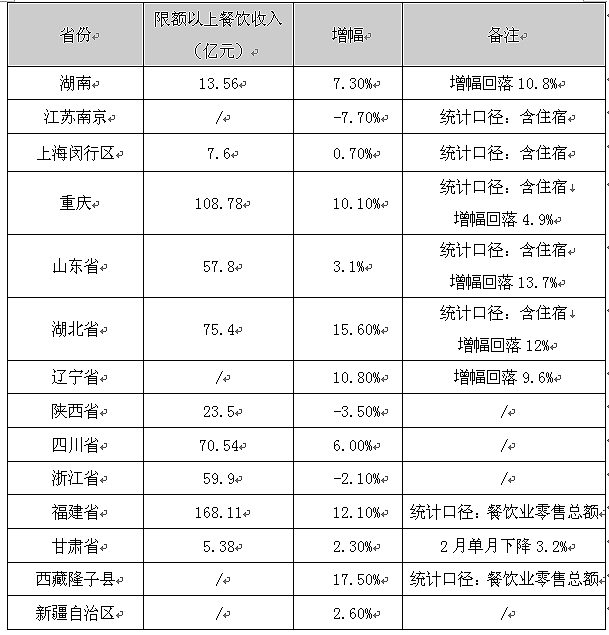 除了湖北和西藏隆子縣的限額以上餐飲收入增幅超過(guò)15%,大部分省市1-2月限額以上餐飲收入增幅都在10%以下,新疆和甘肅這樣的西部經(jīng)濟(jì)落后地區(qū)限額以上的餐飲收入增幅已經(jīng)跌入3%以下,特別是江蘇南京、陜西、浙江1-2月的限額以上餐飲收入直接進(jìn)入負(fù)增長(zhǎng)。而且與去年同期相比餐飲收入增幅回落明顯,湖南、湖北、山東的增幅回落水平都超過(guò)了10個(gè)百分點(diǎn)。