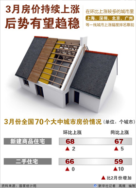 18日,國家統(tǒng)計(jì)局發(fā)布3月份70個(gè)大中城市住宅銷售價(jià)格變動(dòng)情況,3月房?jī)r(jià)繼續(xù)前兩月升溫走勢(shì),漲幅繼續(xù)擴(kuò)大。與此同時(shí),中國土地勘測(cè)規(guī)劃院地價(jià)所發(fā)布的一季度土地市場(chǎng)監(jiān)測(cè)數(shù)據(jù)顯示,受到房地產(chǎn)市場(chǎng)回暖影響,一二線城市中,除哈爾濱外,其他城市一季度住宅地價(jià)全部環(huán)比上漲。專家表示,現(xiàn)階段解決房?jī)r(jià)上漲問題難度較大,但新政將抑制過快上漲勢(shì)頭,而新政影響時(shí)限將決定于地方政府對(duì)新政的執(zhí)行力度?傮w來看,二季度房地產(chǎn)市場(chǎng)將整體呈現(xiàn)量縮價(jià)穩(wěn)的態(tài)勢(shì)。