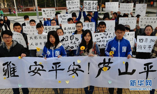 4月20日,山東聊城大學(xué)美術(shù)學(xué)院的大學(xué)生在為雅安地震災(zāi)區(qū)同胞祈福、加油。當(dāng)日8時02分,四川省雅安市蘆山縣發(fā)生7.0級地震。災(zāi)情牽動著億萬同胞的心,人們用不同的方式為雅安地震災(zāi)區(qū)人民祈福,哀悼地震遇難同胞。截至20日16時40分,雅安蘆山地震已造成四川113人死亡。新華社發(fā)