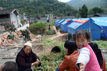 |   4月25日,蘆山縣寶盛鄉(xiāng)玉溪村1100多名村民全部入住由武警四川總隊(duì)一支隊(duì)為他們支起的187頂帳篷。村頭干活的魏大媽高興地說(shuō),這是我們的“玉溪新村”。新華社發(fā) (劉海山/攝) |  |