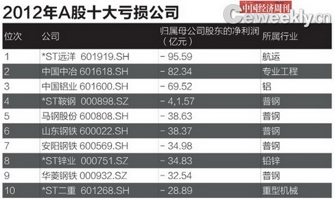 2012年A股十大虧損公司依次是:*ST遠(yuǎn)洋、中國(guó)中冶、中國(guó)鋁業(yè)、*ST鞍鋼、馬鋼股份、山東鋼鐵、安陽鋼鐵、*ST鋅業(yè)、華菱鋼鐵、*ST二重。