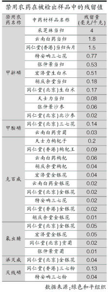 綠色和平抽檢的樣本主要來源于同仁堂藥店、云南白藥大藥房、云南特安吶藥房、九芝堂、天士力大藥房、廣藥集團(tuán)的采芝林、山東宏濟(jì)堂、胡慶余堂、張仲景大藥房九家連鎖中藥房,均為品牌中藥店,采購的中藥材品種主要為當(dāng)歸、三七、枸杞、金銀花等常用中藥材。