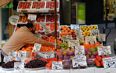 一名小販7月2日在悉尼中央商務(wù)區(qū)打理自己的水果攤。當(dāng)日,澳大利亞央行(澳聯(lián)儲(chǔ))宣布,官方基準(zhǔn)利率維持在2.75%的水平不變。澳聯(lián)儲(chǔ)總裁史蒂文斯在議息會(huì)議結(jié)束后表示,當(dāng)前實(shí)施的寬松貨幣政策有助于澳大利亞經(jīng)濟(jì)增長(zhǎng)。他還說(shuō),物價(jià)水平保持穩(wěn)定,為央行提供了進(jìn)一步降息的空間。