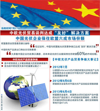 隨即,商務(wù)部網(wǎng)站發(fā)表了商務(wù)部新聞發(fā)言人沈丹陽的談話,對(duì)中歐達(dá)成價(jià)格承諾安排表示贊賞和歡迎。歐委會(huì)貿(mào)易委員德古赫特也于當(dāng)?shù)貢r(shí)間27日在布魯塞爾宣布了這一消息,他說,經(jīng)過數(shù)周緊張談判,中歐就光伏爭端已達(dá)成“友好”解決方案,歐盟很高興取得一份滿意的有關(guān)中國輸歐光伏產(chǎn)品的價(jià)格協(xié)議。