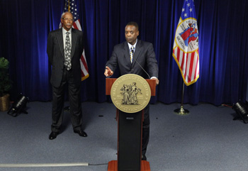 |   7月18日,美國(guó)底特律緊急財(cái)政管理人凱文·奧爾(右)在底特律出席新聞發(fā)布會(huì)。奧爾當(dāng)天獲密歇根州州長(zhǎng)里克·斯奈德授權(quán),向位于底特律的美國(guó)破產(chǎn)法院遞交破產(chǎn)申請(qǐng)。  新華社/美聯(lián) |  |