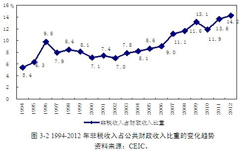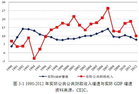 分稅制改革之后,從1997年開始,中國政府的公共財(cái)政收入迅速增長,1996-2012年,公共財(cái)政收入的年均增長速度超過經(jīng)濟(jì)增長速度6.51個百分點(diǎn),公共財(cái)政收入占GDP的比重因此迅速上升(圖3-1)。⑽