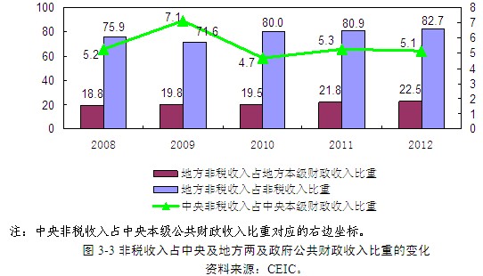 3.進(jìn)一步考察公共財(cái)政收入的構(gòu)成可以發(fā)現(xiàn),自分稅制改革之后,地方各級政府所能支配的規(guī)范的稅收收入急劇減少。為了滿足自身開支的需要,地方各級政府熱衷于通過各種稅外融資方式(目前主要包括非稅收入、政府性基金收入、社會保險基金收入和國有資本經(jīng)營收入等)獲取收入。圖3-2表明,1994年分稅制以來,單就公共財(cái)政收入而言,非稅收入在其中所占的比重逐年上升:由1994年的5.4%增長到2012年的14.2%,提高了8.8個百分點(diǎn)。圖3-3顯示,2008-2012年期間,在全國非稅收入中,地方政府約占80%,占地方政府本級公共財(cái)政收入的20%左右;而中央政府的非稅收入僅為全國非稅收入的近20%,約占中央政府本級公共財(cái)政收入的5%。