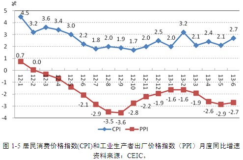 至2013年6月(圖1-5),消費者價格指數(shù)(CPI)同比上漲2.7%,其中翹尾因素貢獻(xiàn)70.4%,當(dāng)年價格上漲因素貢獻(xiàn)29.6%?鄢称泛湍茉吹腃PI上漲1.7%,非食品CPI上漲1.6%。結(jié)合環(huán)比數(shù)據(jù),上半年CPI的變化較為平緩。另一方面,工業(yè)生產(chǎn)者出廠價格指數(shù)(PPI)持續(xù)下降。至6月,PPI同比下跌2.7%,而且下跌的幅度不斷擴(kuò)大。PPI下降可能源自于大宗商品價格的下跌;⑴同時也是現(xiàn)階段中國鋼鐵、煤炭、玻璃、鋁、光伏、水泥等行業(yè)(結(jié)構(gòu)性)產(chǎn)能過剩的體現(xiàn)。