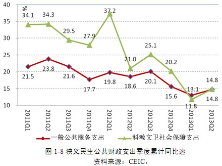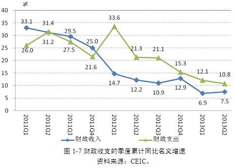 綜上,2013年上半年外部市場需求低迷加上國內(nèi)產(chǎn)能過剩,導(dǎo)致工業(yè)生產(chǎn)增長乏力,經(jīng)濟(jì)增速持續(xù)下降,公共財政收入增速大幅下滑。盡管價格水平保持平穩(wěn),但是,城鄉(xiāng)居民實際收入增速的減緩,從根本上抑制了居民消費需求的擴(kuò)張。國有企業(yè)投資、國內(nèi)貸款投資以及交通運輸領(lǐng)域投資增速的大幅度提高,一定程度上抵消了私人部門制造業(yè)投資增速的下滑,使固定資產(chǎn)投資增速得以保持穩(wěn)定增長。投資依然是經(jīng)濟(jì)增長的主要動力,中國經(jīng)濟(jì)結(jié)構(gòu)失衡的局面也在繼續(xù)。下半年,雖然世界經(jīng)濟(jì)的恢復(fù)性增長將有利于緩解中國出口增長持續(xù)下降的壓力,使中國經(jīng)濟(jì)2013年有望實現(xiàn)中央年初制定的7.5%的增長目標(biāo)。但是,經(jīng)濟(jì)結(jié)構(gòu)失衡的局面不僅沒有改善的跡象,相反,卻有進(jìn)一步加劇的趨勢,尤其是在公共財政收入增速下降的背景下,公共財政支出中用于民生的支出增速比政府的一般公共服務(wù)支出增速更為急劇地下降,抑制了公共財政支出向民生領(lǐng)域的傾斜,城鄉(xiāng)居民實際收入增速的下滑,都將阻礙中國經(jīng)濟(jì)轉(zhuǎn)變經(jīng)濟(jì)發(fā)展方式、調(diào)整經(jīng)濟(jì)結(jié)構(gòu)失衡,居民收入與經(jīng)濟(jì)的同步增長。