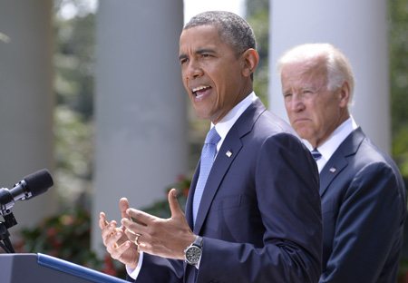 圖為8月31日美國(guó)總統(tǒng)奧巴馬在副總統(tǒng)拜登陪同下,在白宮玫瑰花園就敘利亞問(wèn)題發(fā)表聲明。