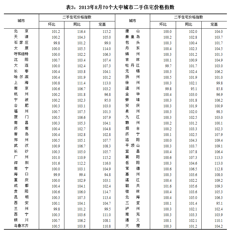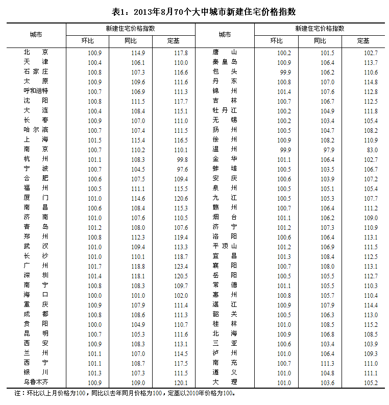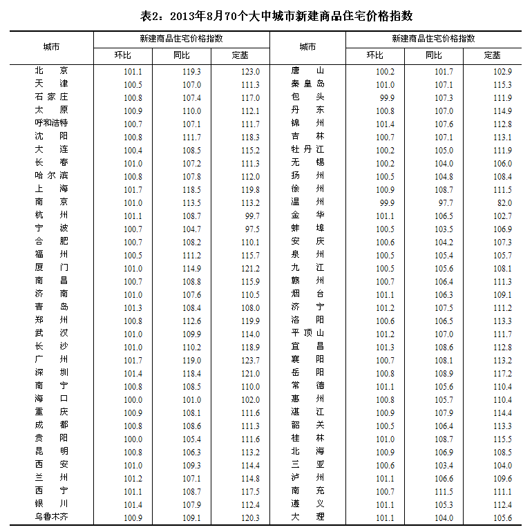 國家統(tǒng)計局9月18日公布2013年8月份70個大中城市住宅銷售價格變動情況,與上月相比,70個大中城市中,新建商品住宅(不含保障性住房)價格下降的城市有2個,持平的城市有2個,上漲的城市有66個。環(huán)比價格變動中,上海漲幅最高,為1.7%,溫州和包頭最低,下降0.1%。與去年同月相比,70個大中城市中,新建商品住宅(不含保障性住房)價格下降的城市有1個,上漲的城市有69個。8月份,同比價格變動中,北京漲幅最高,為19.3%,僅溫州下降,降幅為2.3%。