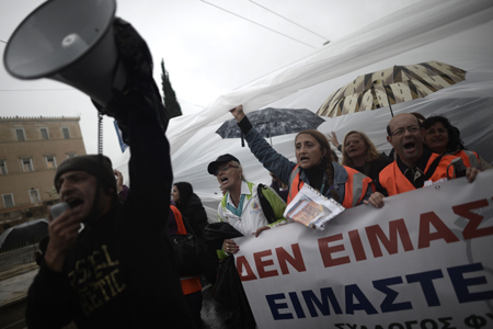 希臘工人6日舉行全國(guó)性24小時(shí)大罷工,抗議政府實(shí)行財(cái)政緊縮政策,公共服務(wù)部門(mén)基本癱瘓。由于交通部門(mén)工人罷工,航運(yùn)以及其他交通運(yùn)輸幾乎停頓。同時(shí),國(guó)際借貸方目前正在考慮是否向希臘進(jìn)一步發(fā)放救援資金。圖為抗議者冒雨在希臘首都雅典游行。
