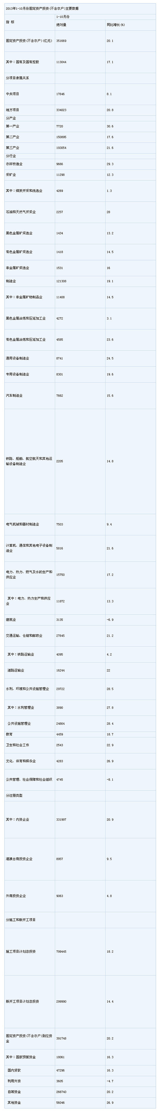 從施工和新開工項目情況看,1-10月份,施工項目計劃總投資799445億元,同比增長18.2%,增速比1-9月份回落0.4個百分點;新開工項目計劃總投資299990億元,同比增長14.4%,增速加快1.1個百分點。