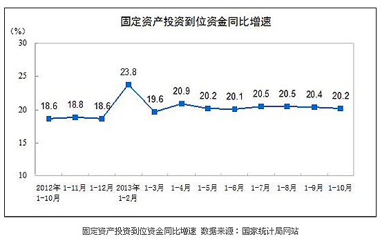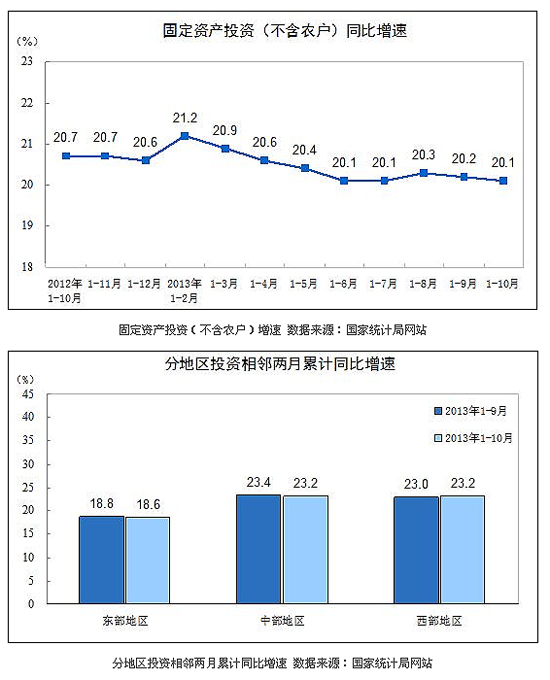 2013年1-10月份,全國固定資產(chǎn)投資(不含農(nóng)戶)351669億元,同比名義增長20.1%,增速比1-9月份回落0.1個百分點。從環(huán)比看,10月份固定資產(chǎn)投資(不含農(nóng)戶)增長1.43%。
