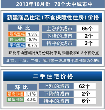 國家統(tǒng)計局18日發(fā)布了10月份70個大中城市住宅銷售價格統(tǒng)計數據。其中,新建商品住宅(不含保障性住房)價格變動情況上,與前月相比,70個大中城市中價格下降的城市有2個,持平的城市有3個,上漲的城市有65個。環(huán)比價格變動中,最高漲幅為1.3%,最低為下降0.1%。