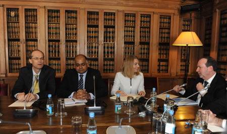 2月26日,在葡萄牙首都里斯本,歐盟代表肖恩·貝里根(右一)、歐洲央行代表扎貝爾·范斯滕基斯特(右二)、國際貨幣基金組織代表蘇比爾·拉爾(左二)與葡議員會(huì)談。 當(dāng)日,由歐盟、歐洲央行和國際貨幣基金組織組成的“三駕馬車”專家組在葡萄牙首都里斯本與葡議長埃斯特韋斯及部分議員舉行會(huì)談,對(duì)該國政府執(zhí)行援助方案情況進(jìn)行第11次評(píng)估。