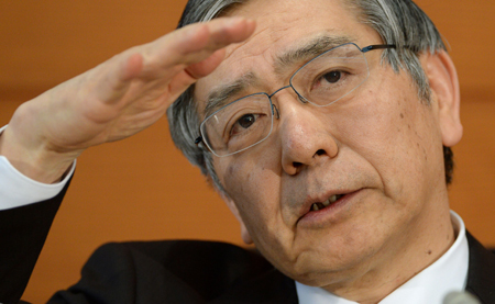 日本中央銀行(日本銀行)11日做出決定,維持現(xiàn)行超寬松貨幣政策不變,同時(shí)連續(xù)第六個(gè)月對(duì)該國(guó)經(jīng)濟(jì)做出“繼續(xù)溫和復(fù)蘇”的評(píng)估。盡管日本經(jīng)濟(jì)增速放緩,且上調(diào)消費(fèi)稅措施即將來(lái)臨,但日本央行依舊看好日本經(jīng)濟(jì)復(fù)蘇前景,認(rèn)為日本經(jīng)濟(jì)將逐漸擺脫通縮困局。圖為日本央行總裁黑田東彥在貨幣政策會(huì)議結(jié)束后出席新聞發(fā)布會(huì)。