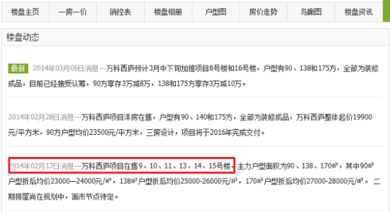 同時(shí)新華網(wǎng)記者發(fā)現(xiàn),根據(jù)杭州萬科的這份聲明,在拿出“捂”了一個(gè)月的預(yù)售證之后,10幢、13幢、14幢、15幢號(hào)樓終于在12月7日推向市場了。當(dāng)然,當(dāng)時(shí)對外杭州萬科也繼續(xù)宣稱二次開盤“售罄”。但在透明售房網(wǎng)的樓盤動(dòng)態(tài)中,2014年2月7日,萬科西廬的9幢、10幢、11幢、13幢、14幢、15幢卻依然在售。曾經(jīng)全部“售罄”的六幢樓又重現(xiàn)市場了。