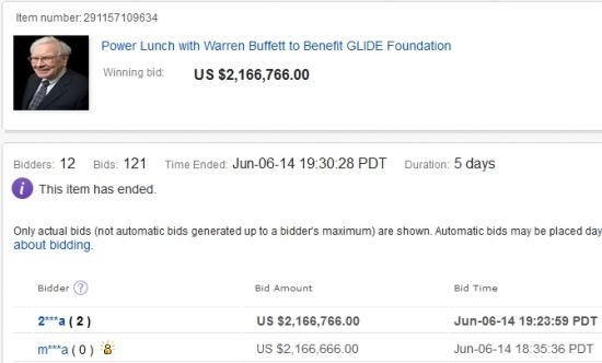北京時(shí)間6月7日上午消息,北京時(shí)間6月7日上午10點(diǎn)半,經(jīng)過12位出價(jià)人121次激烈角逐,2014年巴菲特慈善午餐價(jià)落槌在216.6766萬美元(人民幣1353萬元),超越去年的“低價(jià)”紀(jì)錄。
