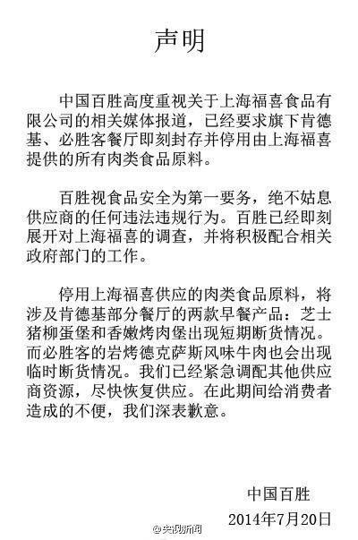 央視新聞【百勝集團回應:封存停用涉事原料】針對供應商提供問題原料被曝光一事,肯德基、必勝客所屬的百勝餐飲集團回應:即刻封存并停用由上海福喜提供的所有肉類食品原料。因停用上海福喜供應原料造成三款產品出現(xiàn)臨時斷貨,已緊急調配其他供應商資源。