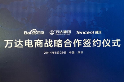 8月29日,萬(wàn)達(dá)、騰訊和百度在深圳聯(lián)合召開(kāi)發(fā)布會(huì),正式宣布在香港注冊(cè)成立電子商務(wù)公司,一期總投資額高達(dá)50億人民幣,其中萬(wàn)達(dá)持股70%,騰訊和百度各持股15%。