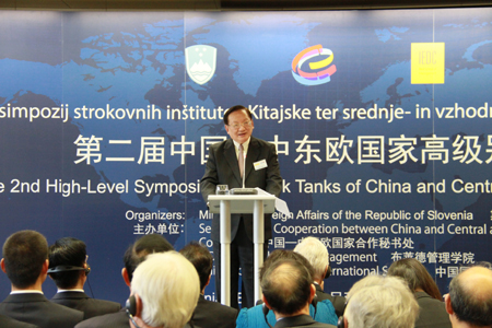 第二屆中國-中東歐國家高級(jí)別智庫研討會(huì)3日在斯洛文尼亞布萊德湖畔舉行。斯洛文尼亞總統(tǒng)帕霍爾會(huì)見了中國前國務(wù)委員唐家璇和外交部副部長王超一行。唐家璇稱中國—中東歐國家合作發(fā)展勢頭強(qiáng)勁,正在成為中歐關(guān)系發(fā)展新的重要引擎。帕霍爾也表示愿意進(jìn)一步強(qiáng)化斯中關(guān)系,推動(dòng)中國—中東歐國家之間的合作。 圖為唐家璇在研討會(huì)開幕式上致辭。