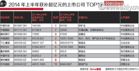 需要說明的是,為更客觀嚴(yán)謹(jǐn)?shù)胤从痴a(bǔ)助對上市公司經(jīng)營業(yè)績的影響,下文中所述的政府補(bǔ)助是根據(jù)上市公司半年報中公布的計(jì)入當(dāng)期損益的政府補(bǔ)助數(shù)據(jù)。比如,中國石油在2014年半年報中披露,今年上半年總共收到政府補(bǔ)助51.74億元,但計(jì)入上半年損益的政府補(bǔ)助為14.21億元,即只有14.21億元計(jì)入了中國石油的上半年凈利潤,所以該公司今年上半年所得政府補(bǔ)助以14.21億元為準(zhǔn)。