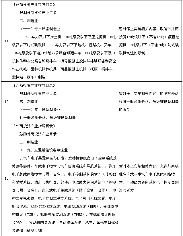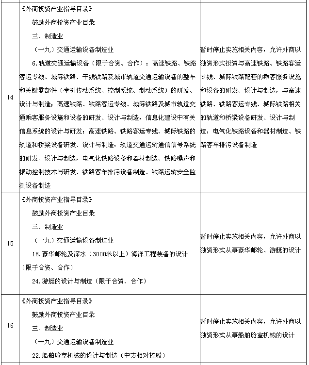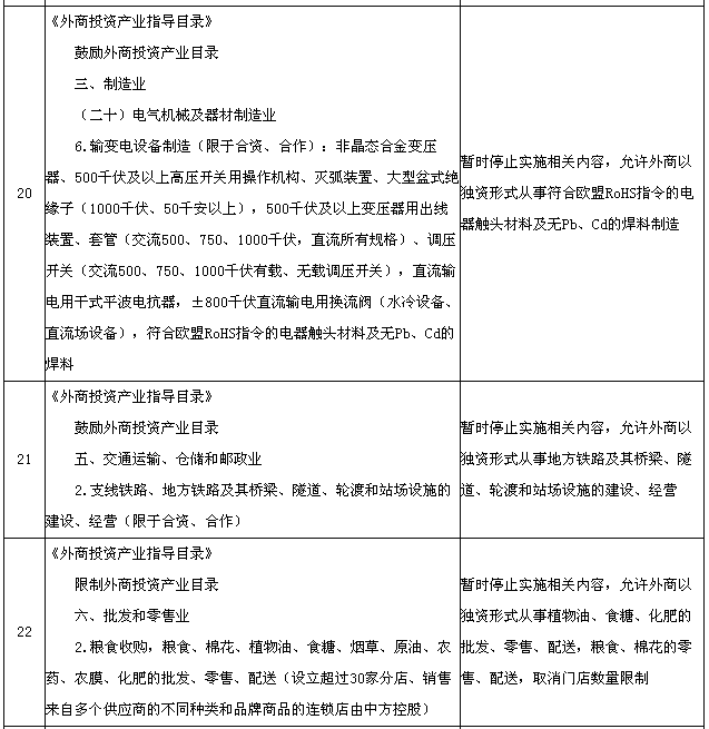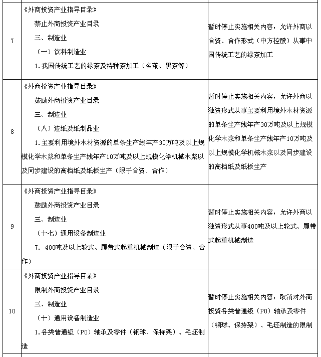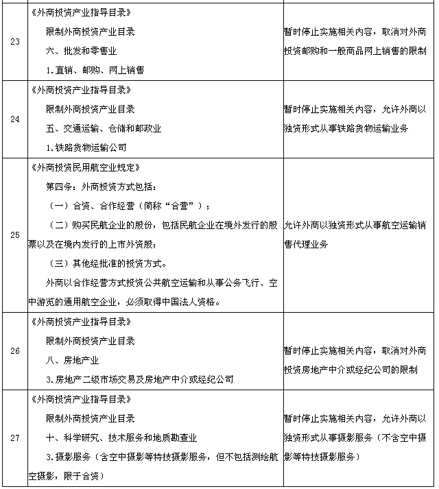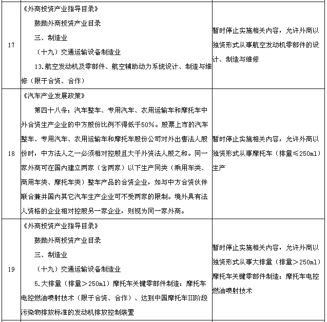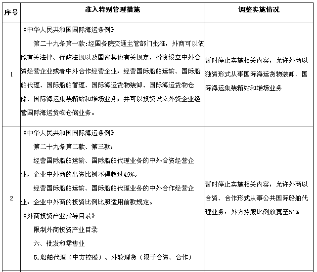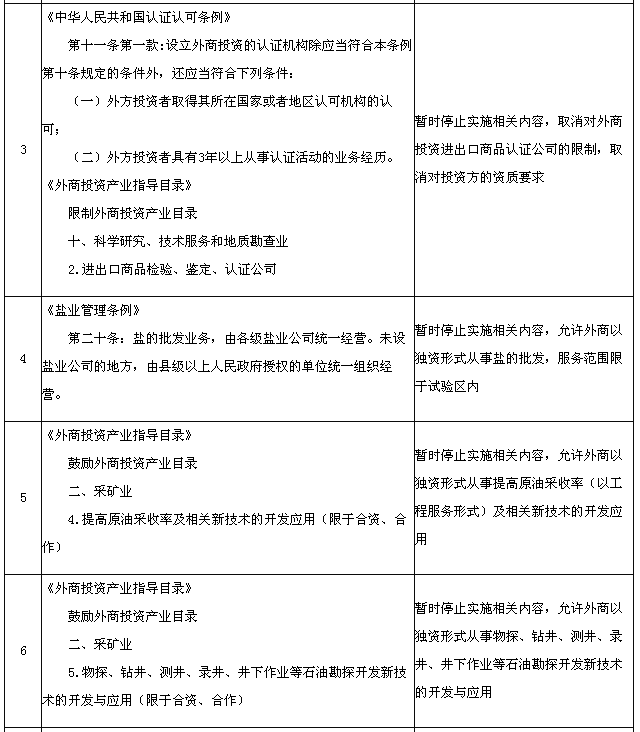 為適應(yīng)在中國(上海)自由貿(mào)易試驗(yàn)區(qū)進(jìn)一步擴(kuò)大開放的需要,國務(wù)院決定在試驗(yàn)區(qū)內(nèi)暫時(shí)調(diào)整實(shí)施《中華人民共和國國際海運(yùn)條例》、《中華人民共和國認(rèn)證認(rèn)可條例》、《鹽業(yè)管理?xiàng)l例》以及《外商投資產(chǎn)業(yè)指導(dǎo)目錄》、《汽車產(chǎn)業(yè)發(fā)展政策》、《外商投資民用航空業(yè)規(guī)定》規(guī)定的有關(guān)資質(zhì)要求、股比限制、經(jīng)營范圍等準(zhǔn)入特別管理措施(目錄附后)。