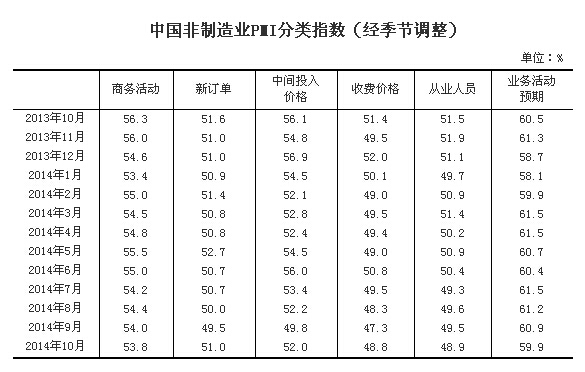 2014年10月,中國非制造業(yè)商務(wù)活動(dòng)指數(shù)為53.8%,比上月回落0.2個(gè)百分點(diǎn),高于榮枯線3.8個(gè)百分點(diǎn),表明我國非制造業(yè)繼續(xù)保持?jǐn)U張態(tài)勢。