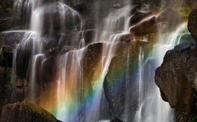 七彩飛瀑處在蜀南竹海石鼓山和石鑼山之間的葫蘆谷中,從深林里流出的水潦河,在回龍橋下分為四級(jí)瀉下懸崖,落差近200米,蔚為壯觀。晴天正午,日光下徹,可見彩虹生于潭底。站于其頭上,下為懸崖峭壁,只能聞其聲而不能睹其貌,故名“飛聲瀑”。 易真明 攝