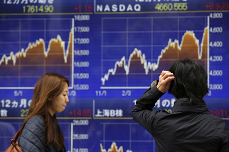 11月12日,在日本東京,人們在證券公司的股票行情電子板前關(guān)注股票行情。 受市場普遍預(yù)期日本首相安倍晉三可能暫緩進(jìn)一步上調(diào)消費(fèi)稅刺激,12日東京股市高開高走,日經(jīng)225種股票平均價格指數(shù)在收盤時比前一個交易日上漲0.43%,創(chuàng)7年來新高。