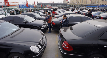近日,中央和國家機(jī)關(guān)公車改革取消車輛第二批拍賣會在新發(fā)地汽車市場開展,100輛奧迪、奔馳、寶馬、凱迪拉克等公務(wù)車輛和外事用車首次“露面”。 圖為:參與購車的市民在挑選車輛。