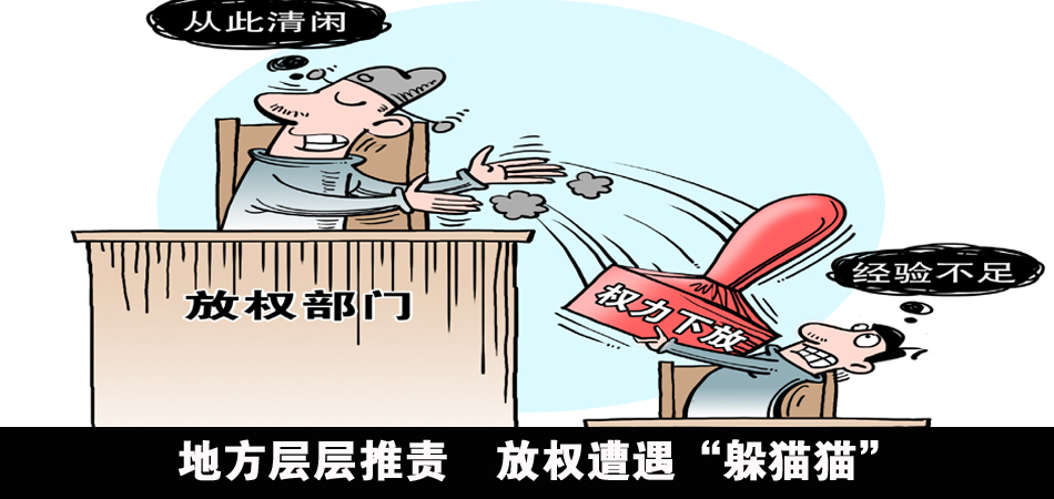 由于怕擔責,不少從上頭“接權”的部門辦事人員常以業(yè)務不熟悉為由,對接手的審批事項拖著不辦,或是跟上級反復請示,有的還必須要單位一把手簽字才能過關。部門之間層層“推權”使得放權被堵在“最后一公里”上,一些企業(yè)主苦不堪言。