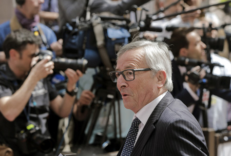 5月11日,歐盟委員會(huì)主席容克抵達(dá)比利時(shí)首都布魯塞爾的歐盟總部,出席歐元區(qū)財(cái)長(zhǎng)會(huì)議。 當(dāng)日,歐元區(qū)財(cái)長(zhǎng)再度聚首布魯塞爾,商討希臘債務(wù)問(wèn)題。